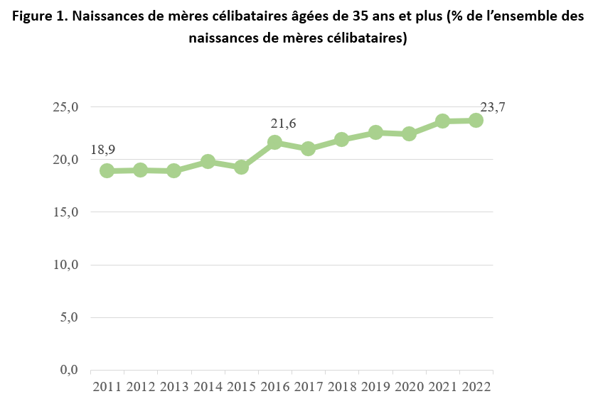 On imagine souvent la mère célibataire comme une très jeune femme tombée enceinte « par accident ». Pourtant, la part des enfants nés de mères célibataires âgées de 35 ans ou plus est passée de 19 % en 2011 à 24 % en 2022 (voir Figure 1). Cela reflète deux choses : (1) le fait que les situations pouvant mener à devenir mère célibataire — grossesse non prévue, rupture ou décès d’un partenaire — peuvent survenir à tout âge, et (2) la tendance générale à avoir des enfants de plus en plus tard.