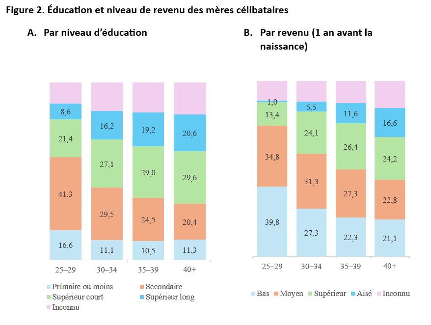 Parmi les mères célibataires les plus jeunes (25 à 29 ans), on trouve la plus forte proportion de femmes ayant un niveau d’éducation primaire (17 %, voir figure 2A) et un revenu annuel avant la naissance faible (40 %, voir figure 2B). [3] Peu d’entre elles ont suivi un enseignement supérieur long (9 %), et encore moins appartenaient à la catégorie de revenu aisée (1 %).