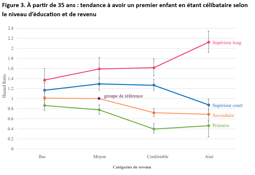 Il est intéressant de noter que contrairement à ce qu’on pourrait imaginer, toutes les femmes célibataires à haut revenu n’ont pas davantage de premier enfant après 35 ans que celles à bas revenu. Seules les plus diplômées en ont davantage. Les femmes à haut revenu mais peu diplômées ont moins de chances d’être mères à un âge avancé, ce qui reflète probablement des conceptions plus traditionnelles de la famille.